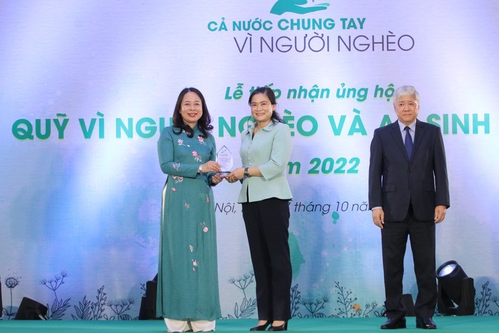 Phó Chủ tịch nước Võ Thị Ánh Xuân trao biểu trưng đơn vị ủng hộ Quỹ “Vì người nghèo” và các chương trình an sinh, xã hội năm 2022 cho Phó Chủ tịch Thường trực Hội LHPN Việt Nam Đỗ Thị Thu Thảo. Ảnh Ng. Thắng